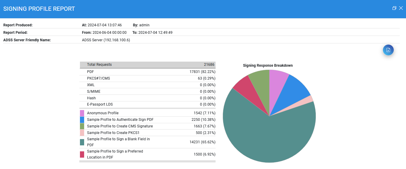 This report type allows you to compare the transactions being received for each of your signing profile. In the following example there are multiple signing profiles like XML Signing, PDF Signing and CMS Signing etc. The figures and the pie chart shows the amount of requests which referred to each signing profile: