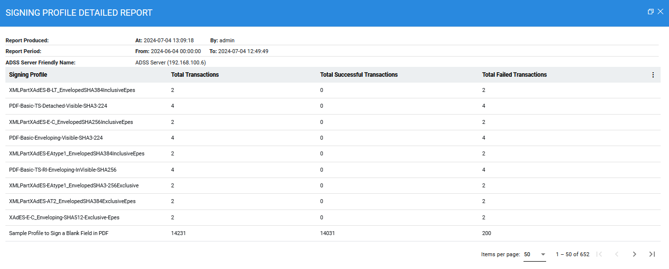 Clicking on the download icon allows the user to export the report in PDF format. Clicking on the 'View Detailed Signing Report' button displays the following screen: