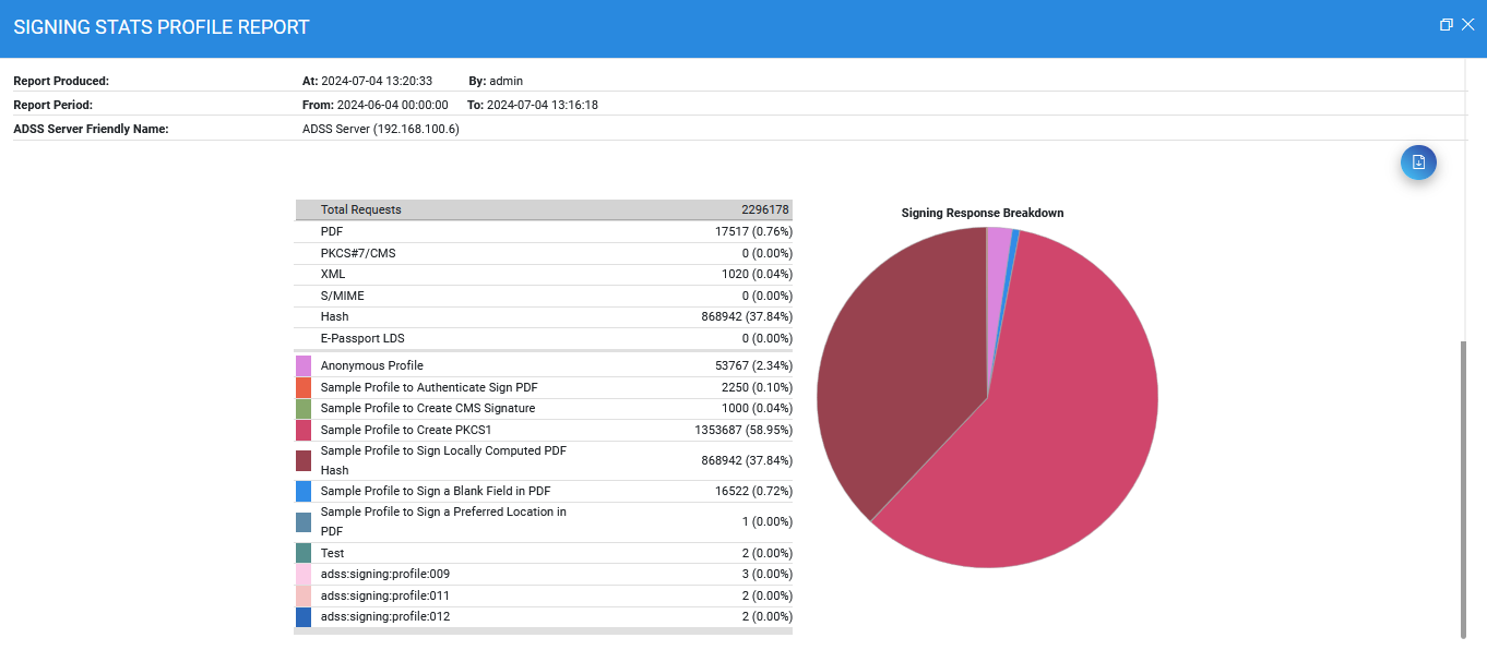 This report type allows you to compare the transactions being received for each of your signing profile. In the following example there are three signing profiles called XML Signing, PDF Signing and File Signing, the figures and the pie chart shows the amount of requests which referred to each signing profile: