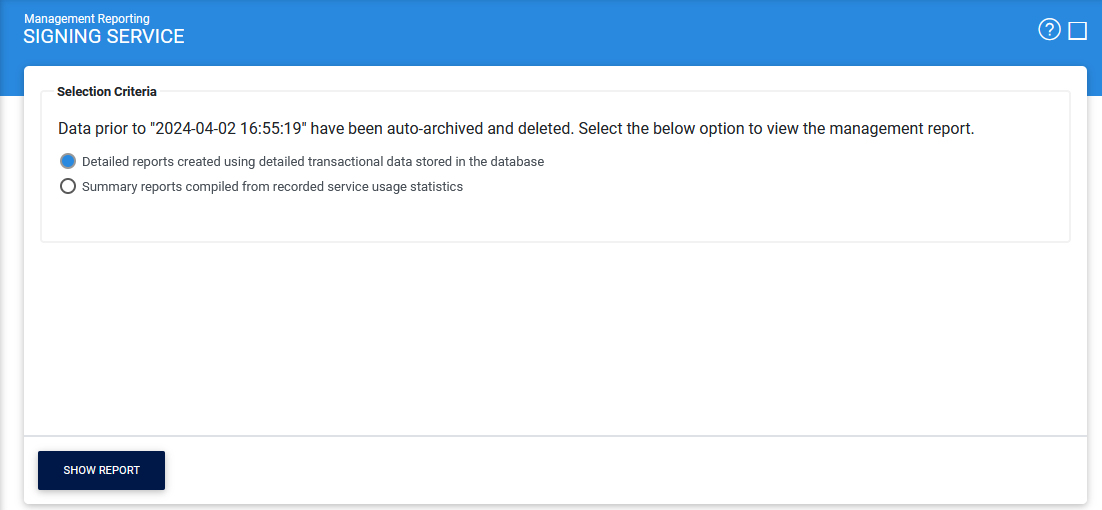 Live Data reports are generated based on the entire history of ADSS Server's data stored in transaction logs. Signing Service shows the following options to view the Management Reporting.