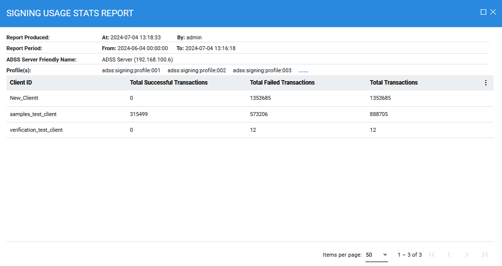 Select a particular signing profile for which you want to see the statistics otherwise choose ALL option. By pressing the Show Report button the screen will be refreshed to show you the results concerning the number of success and failed transactions during that date range. |