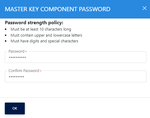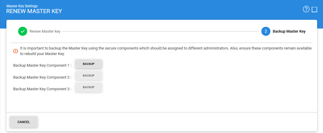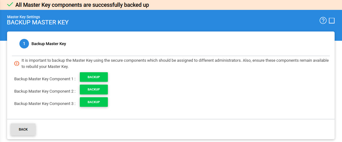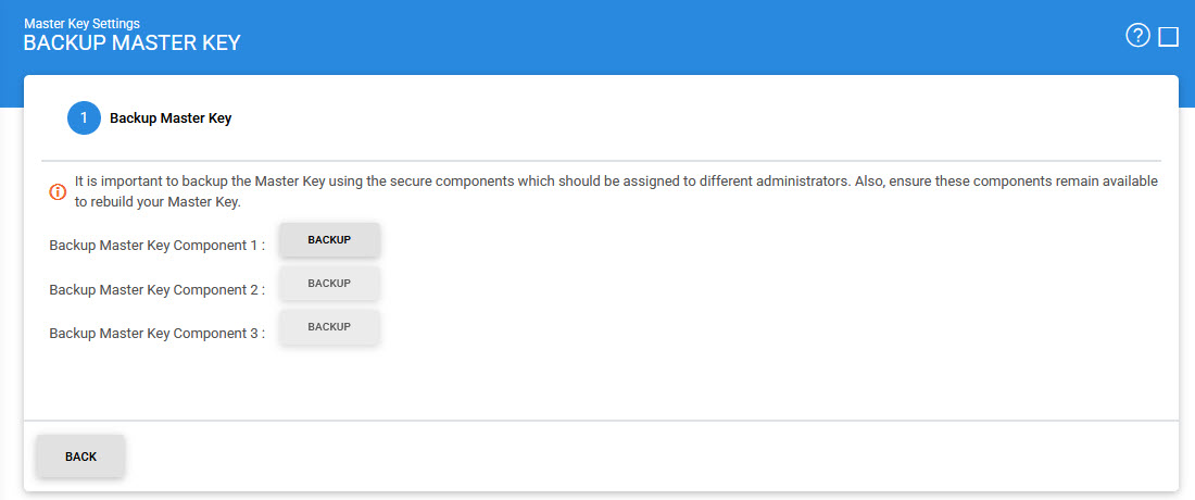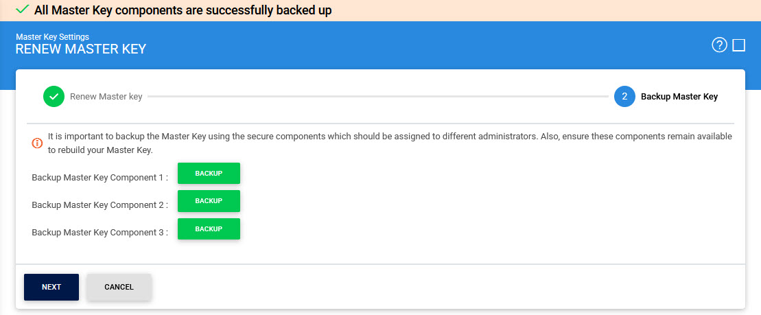 At this stage, the Master Key has been generated, now the backup of the generated master key needs to be taken. Three users will be required to take backup of each component. Clicking on the backup button will lead you to the following screen: