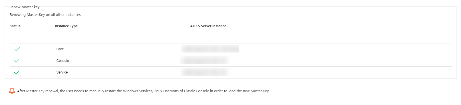 Upon the renewal of master key, the required information has to be synchronized with other instances as well. The above screen shows the progress of synchronization of instances running in load balance mode. As soon as an instance is synchronized, a tick mark appears in the status column against that instance.