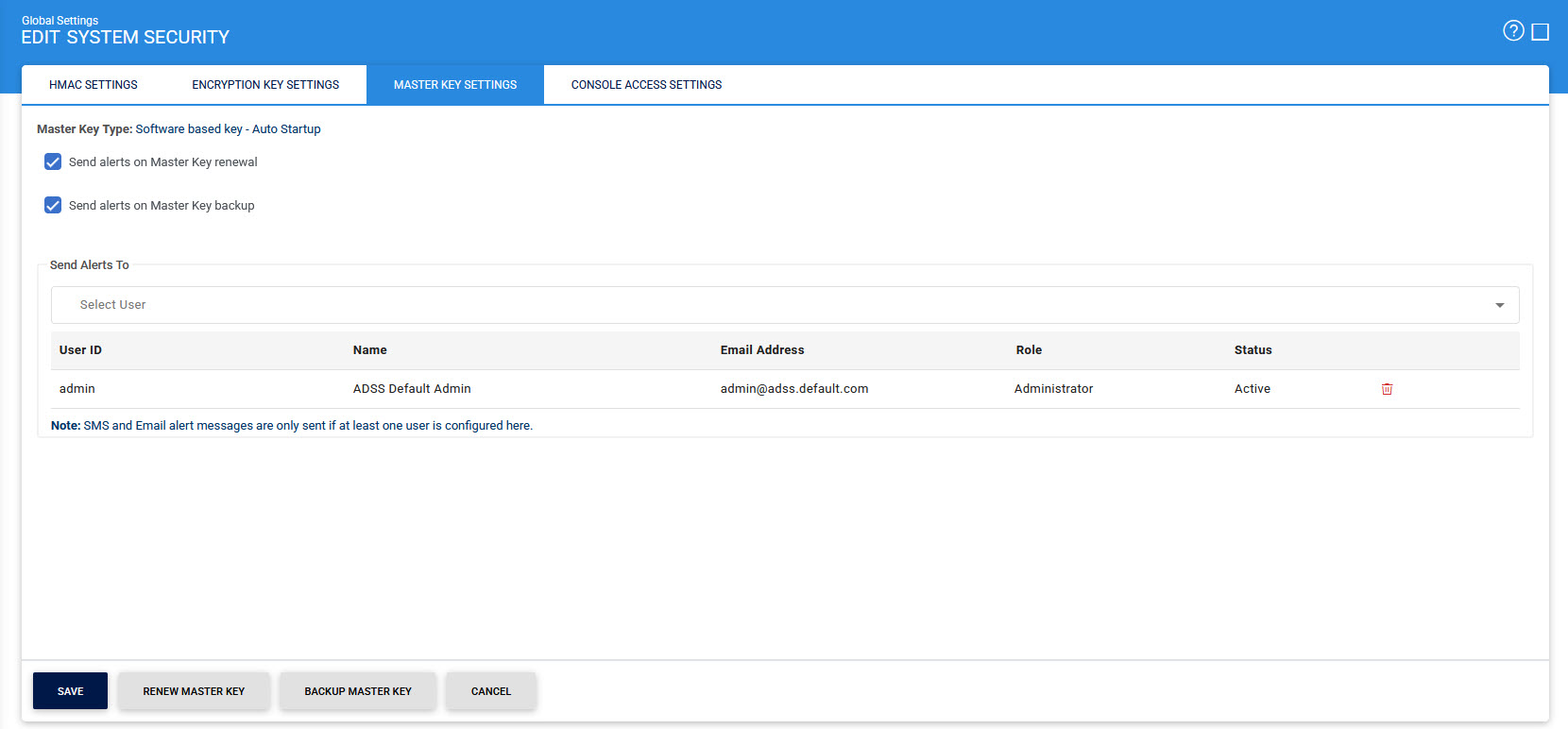 Once pre-requisites are satisfied, we can carry on with our configurations. To renew the master key navigate to ADSS Console > Global Settings > System Security > Master Key Settings section. It will display the following screen: