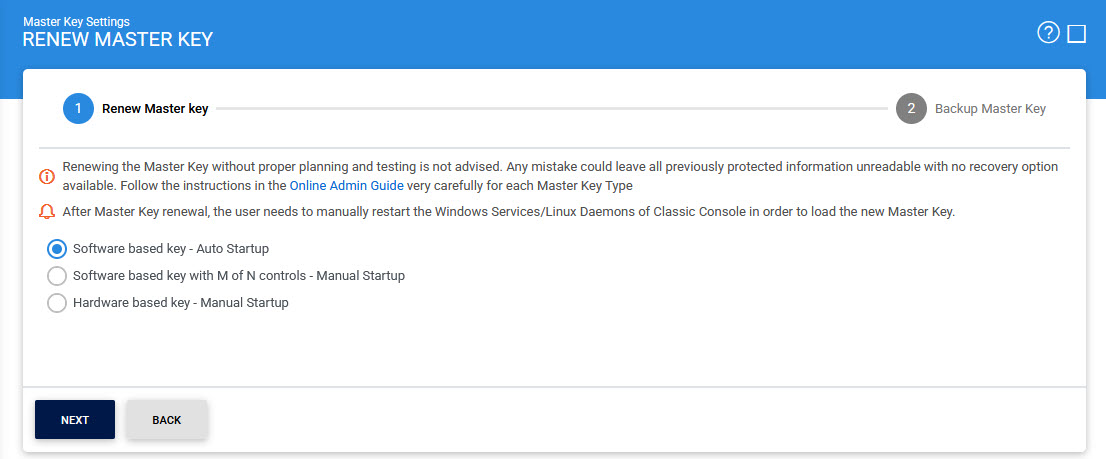 In the above screen, the Master Key Type can be seen and if the user wants to receive alerts upon renewal or backup of master key, it is recommended to enable the alerts by marking the respective checkbox. Clicking on Renew Master Key button will lead you to the screen below: