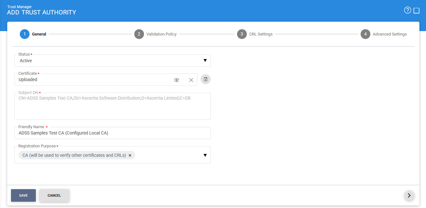 When registering a trusted Authority with purpose other than CA, the wizard finishes after this screen and no more details are required. While registering the a CA, additional information is required and the additional steps described below must be followed before the wizard completes. |