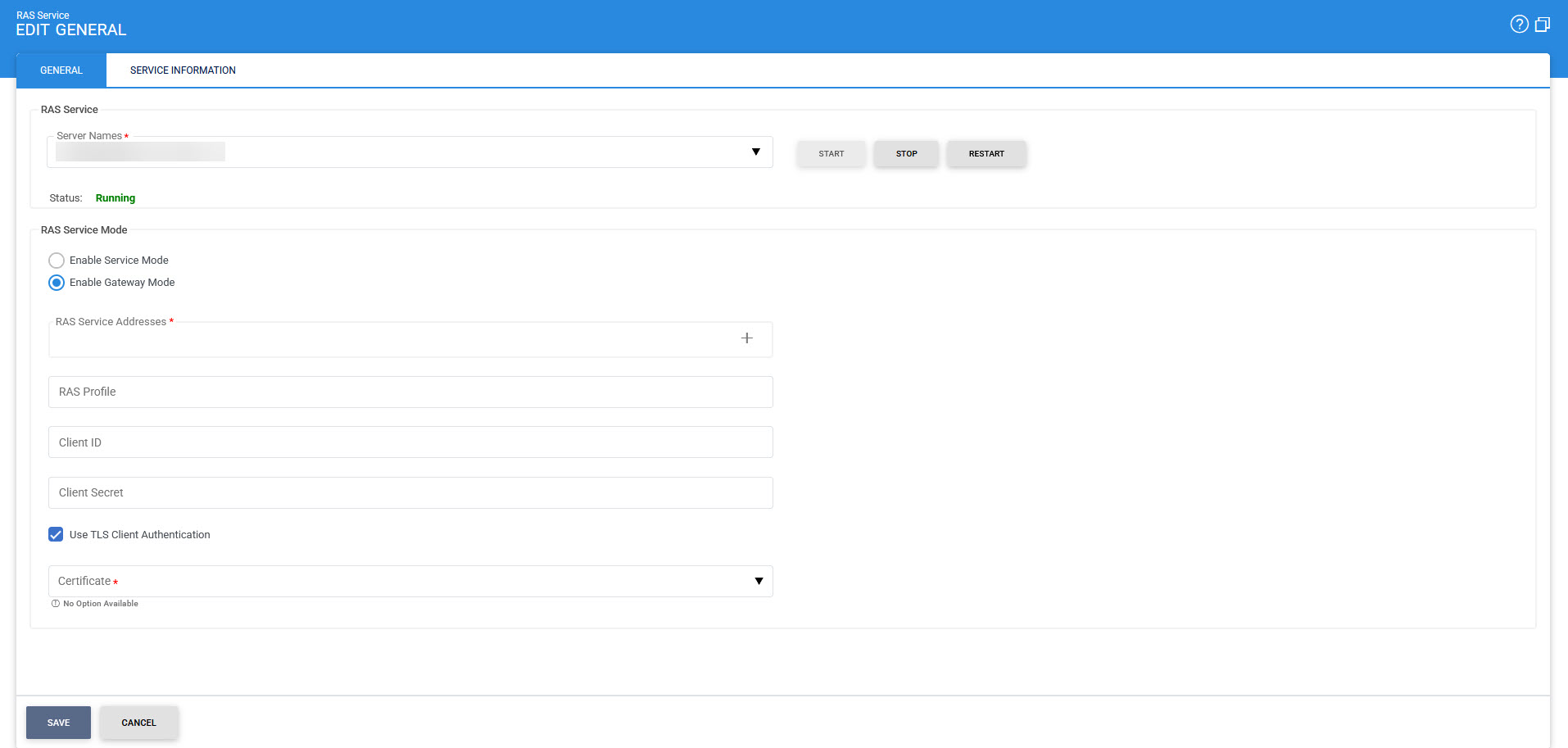 If this option is enabled then RAS Service will communicate with back-end RAS Service using TLS client authentication. Note: By default it is disabled. |