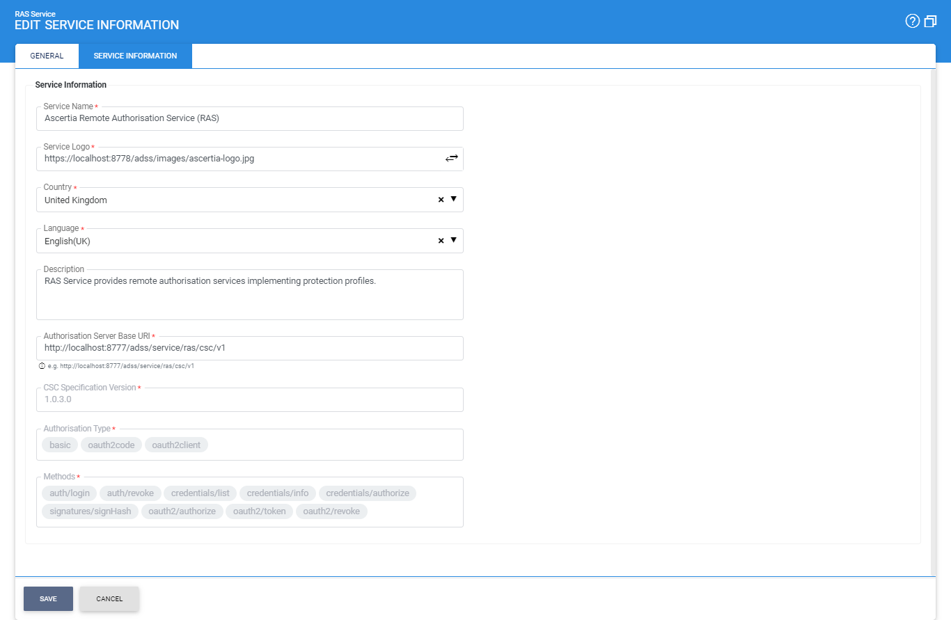 This tab displays information about RAS Service and its capabilities. The clients can retrieve this information by invoking "/info" API of CSC Protocol and the information configured on this screen will be returned in response. All the information on this tab is configured according to the CSC specification.