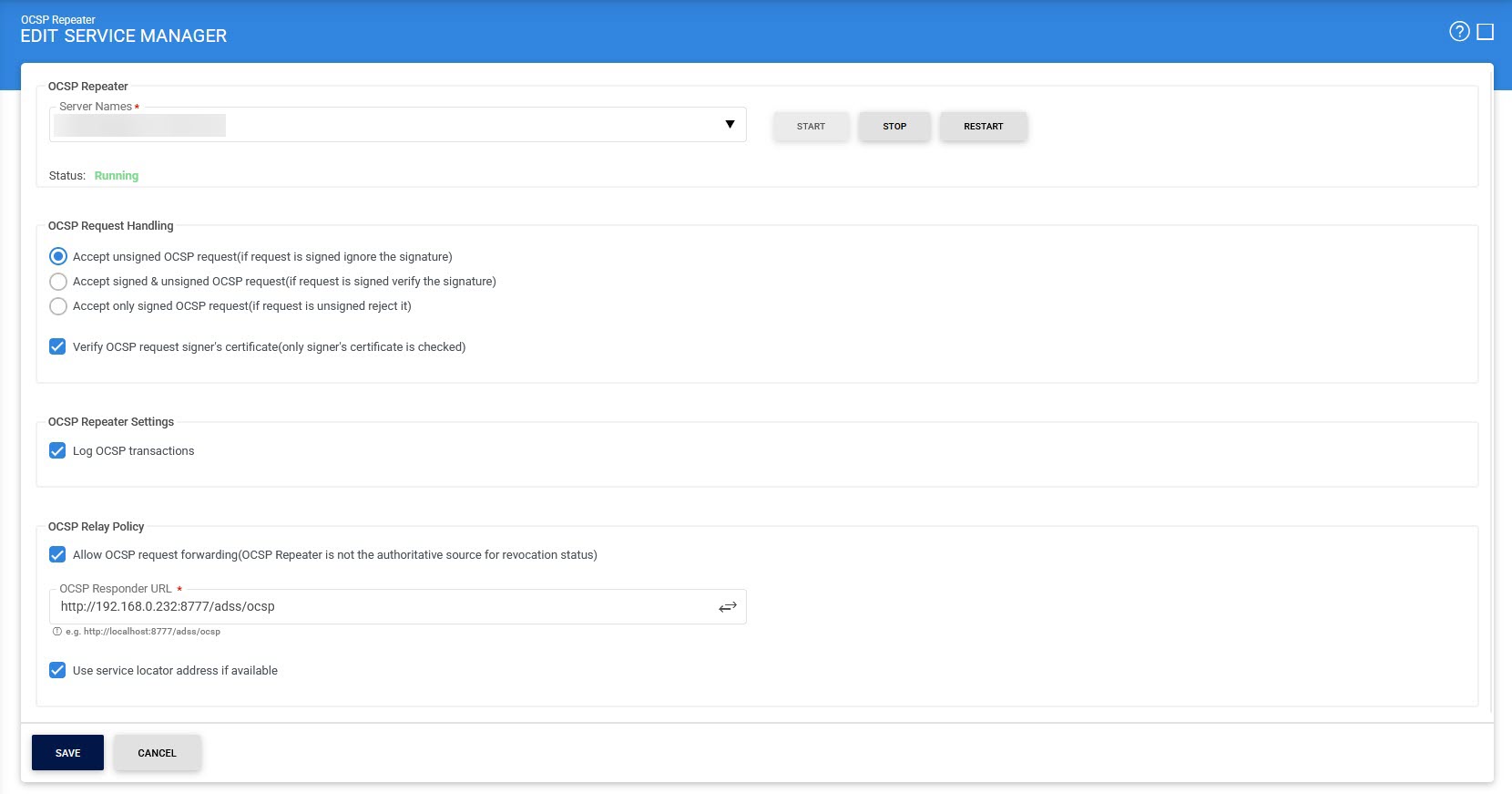 After making configuration changes within the ADSS OCSP Repeater Service, the service must be restarted for the changes to take effect. The OCSP Repeater service manager module allows operators to start, stop or restart the OCSP Repeater service and also make changes to service related configurations.