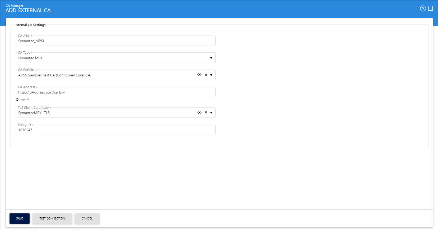 To configure the Symantec MPKI (Managed Public Key Infrastructure) v7.5 CA as an external CA select the Symantec MPKI option from the CA Type drop down. The following page will be shown to configure the Symantec MPKI:
