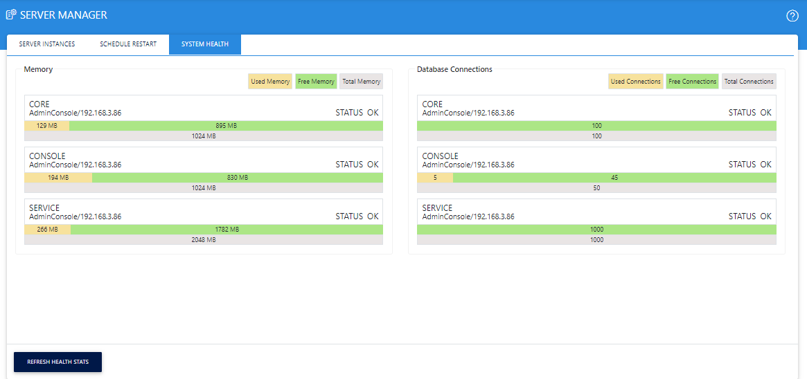 Click on the System Health button from the Server Manager page and it will redirect you for ADSS Server overall system status. From this page you can check the status of all the instances, memory usage and database connections usage.