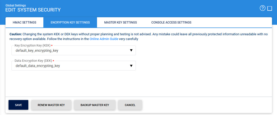 - Change the KEK/DEK and press the Save button for the changes to take effect. By pressing Save button, all secure objects will be re-encrypted under new KEK/DEK and this operation can take time according to the size of data so be patient and wait for the operation to complete.