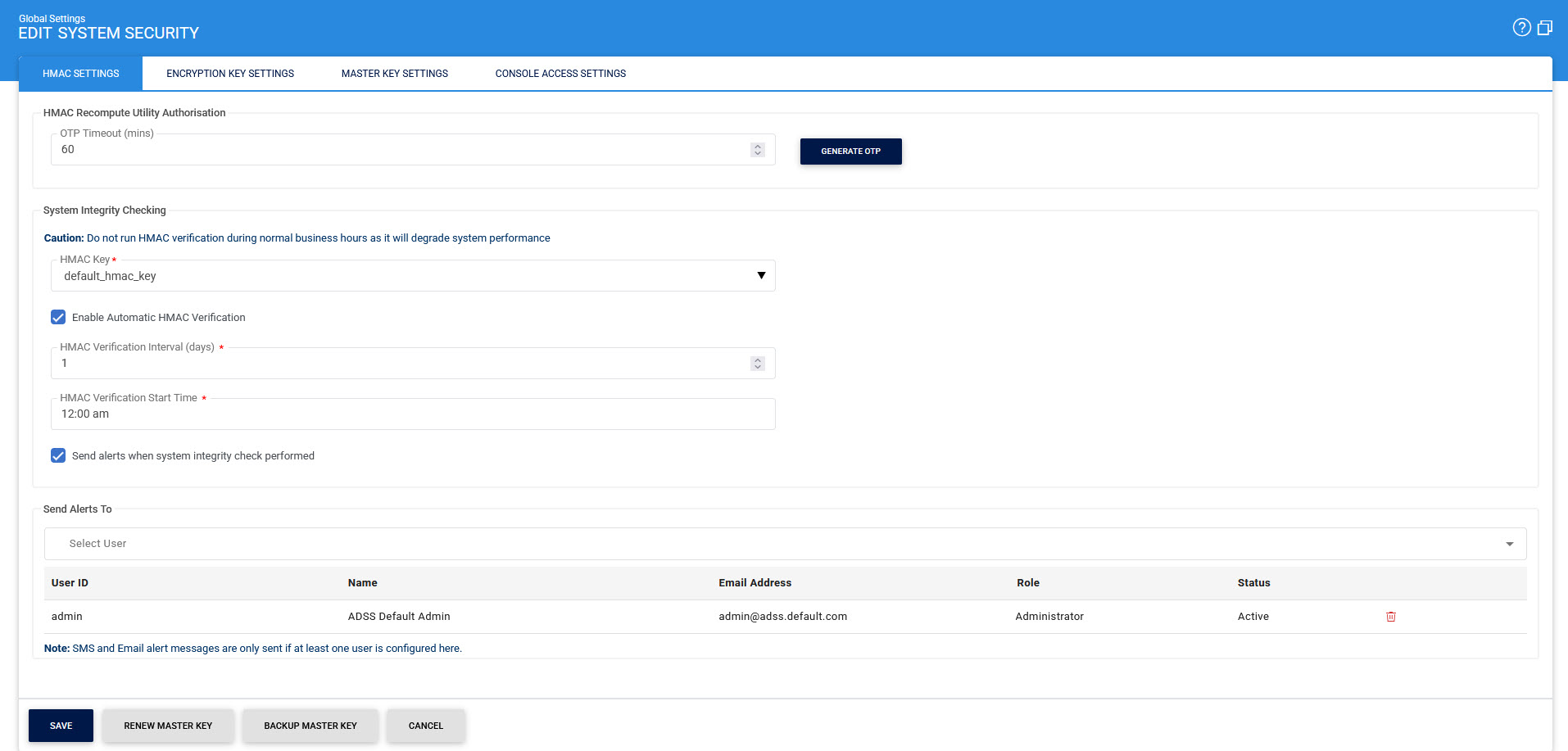 If the checkbox is enabled, an alert will be sent to the configured user upon taking the backup of master key. |