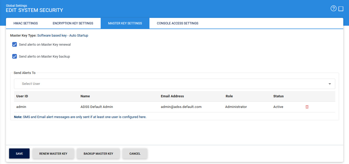 If the checkbox is enabled, an alert will be sent to the configured user upon the renewal of master key. |