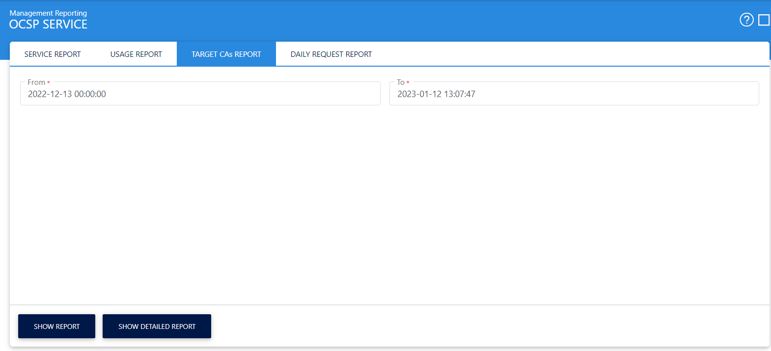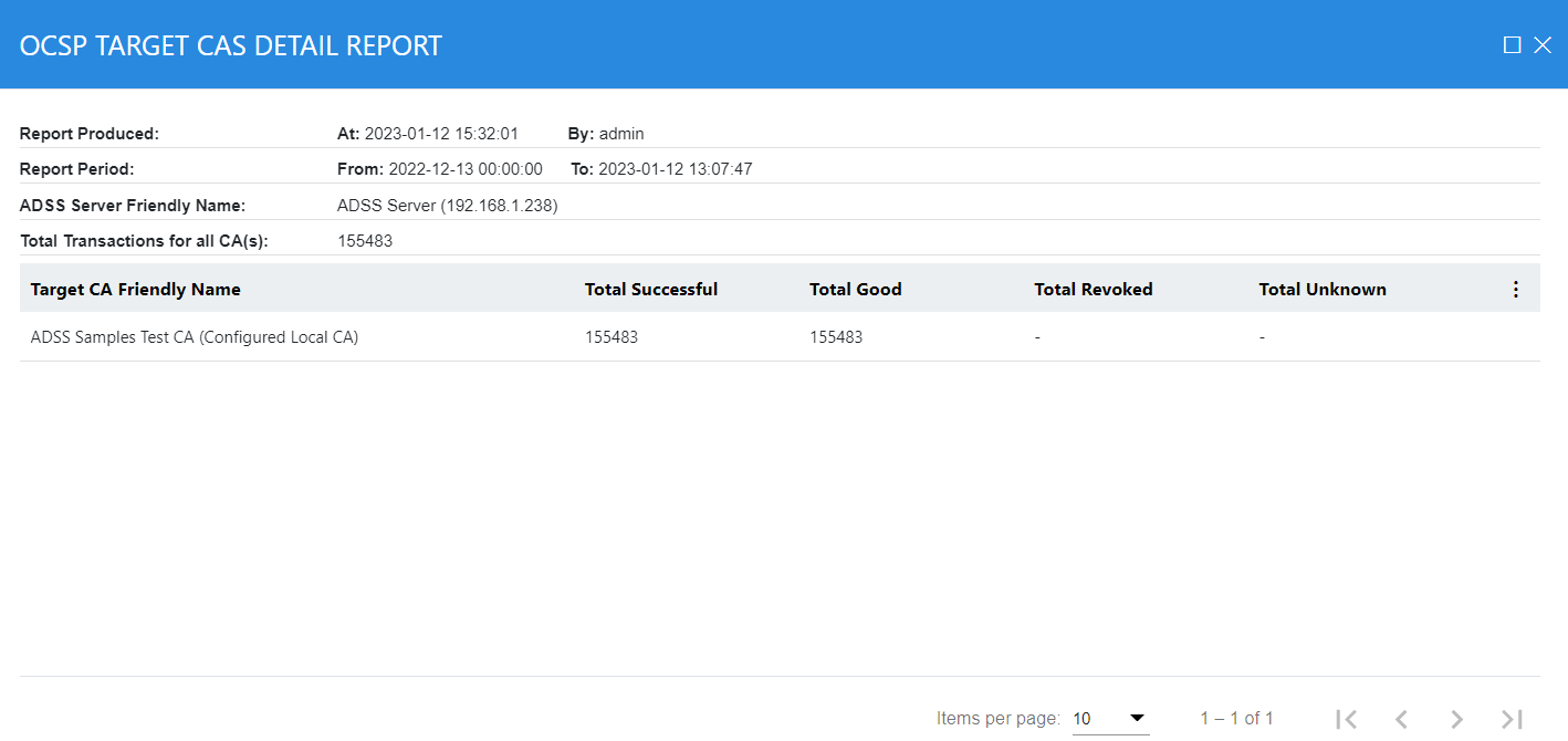 Clicking on View Detailed CA Report button will show the total number of successful, good, revoked and unknown requests for all the CAs: