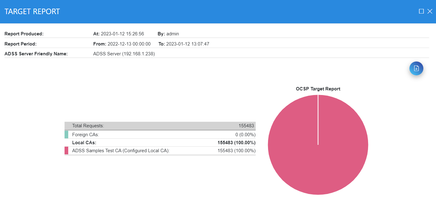 In this report the Foreign CA represents the fact the OCSP transaction was forwarded to a peer OCSP responder because the local OCSP service was not authoritative for the target CA. Hence these transactions are grouped together and shown under the category of “Foreign CAs”. This report can be exported as a PDF document.