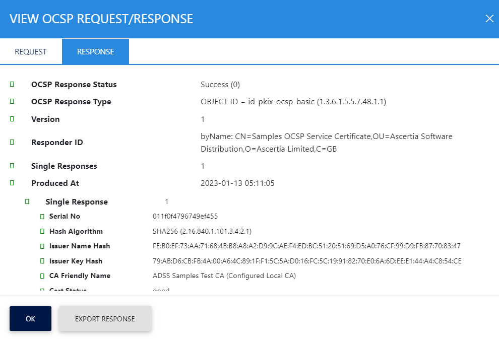 Clicking on either View link within the Response column or the View Response button shows response for the OCSP transaction as shown below: