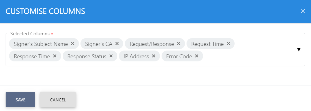 Clicking on the Customize Columns button on OCSP Transactions Log Viewer displays following screen: