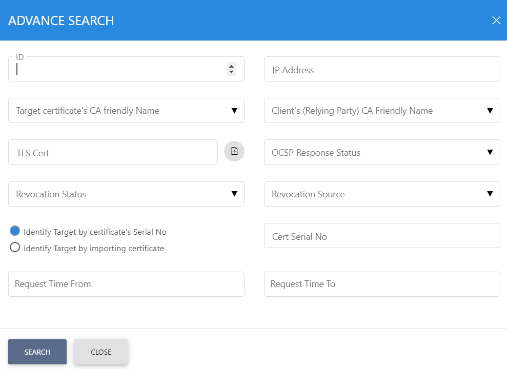 This helps to locate a particular type of OCSP service transaction. The transaction can be searched based on "Log ID", "IP Address", "Target certificate's CA friendly Name", "Client's (Relying Party) CA Friendly Name", "TLS Certificate", "OCSP Response Status", "Revocation Status", "Revocation Source", " Identify Target by certificate's Serial No", " Identify Target by importing certificate" "Request Time From" and "Request Time To". If a search is based on multiple values, then these will be combined together using the “AND” operand, and thus only records that meet all the criteria will be presented. Using this search filter you can create custom reports based on: