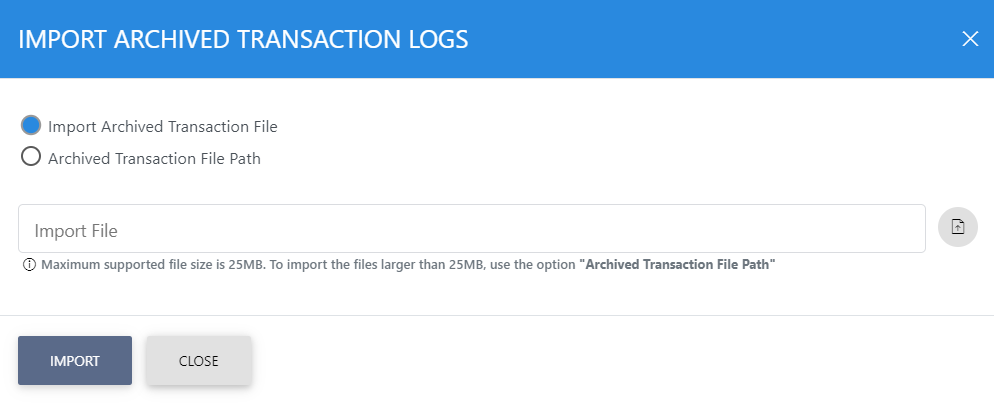This opens a new window where you can import and view previously archived file i.e. archived/exported transactions log. |