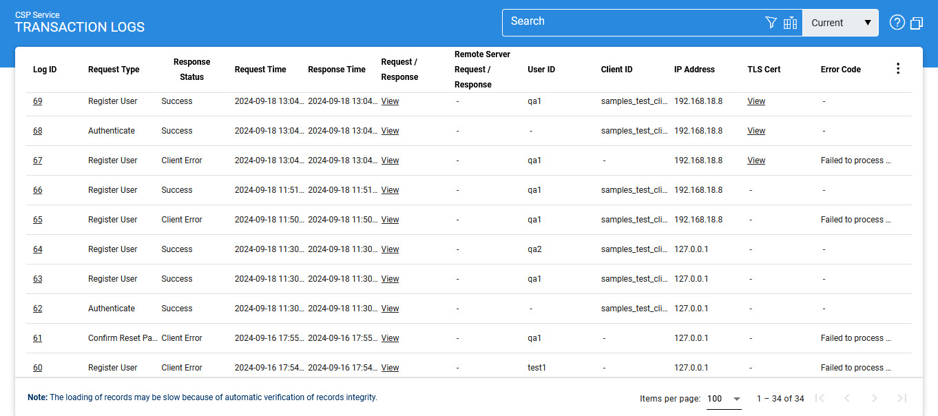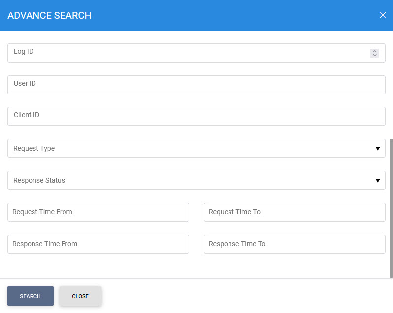 This helps to locate a particular type of CSP Service transaction. The transaction can be searched based on "Log ID", "User ID", "Client ID", "IP Address", "Request Type", "Response Status", "Request Time From", "Request Time To", "Response Time From" and "Response Time To". If a search is based on multiple values, then these will be combined together using the “AND” operand, and thus only records that meet all the criteria will be presented.