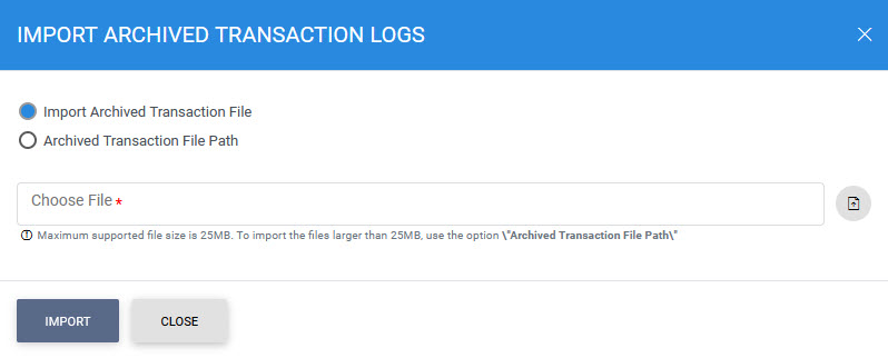 Use this option if the file size is greater than 25 MB. This option does not upload the archived file to the server. Rather the server reads the file from given file path before importing which is faster than the above option. You can either specify the local file system path or a network path. Note: Do specify the archived log file name in the file path. |