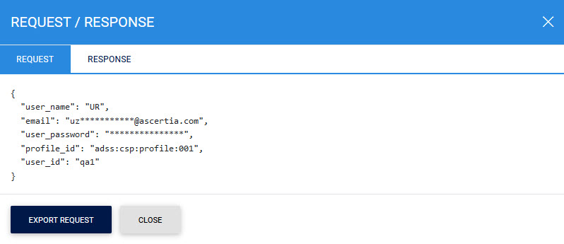 Clicking on View link under the request/response column shows the JSON request and response for the selected CSP transaction record in different tabs: