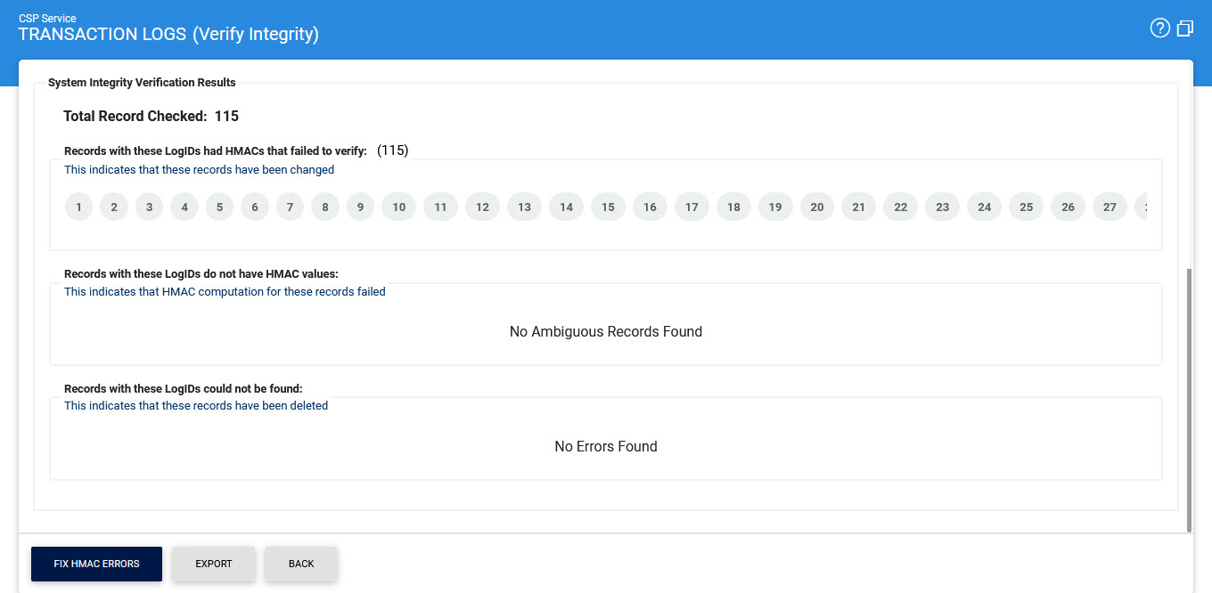 Verifies the integrity of the CSP Service transaction log records. It detects tampered and deleted records, generates a report that can be exported to a physical drive. Note: When exporting HMAC verification reports, it is recommended to save the file with .html extension so that the report can be viewed in an internet browser. |