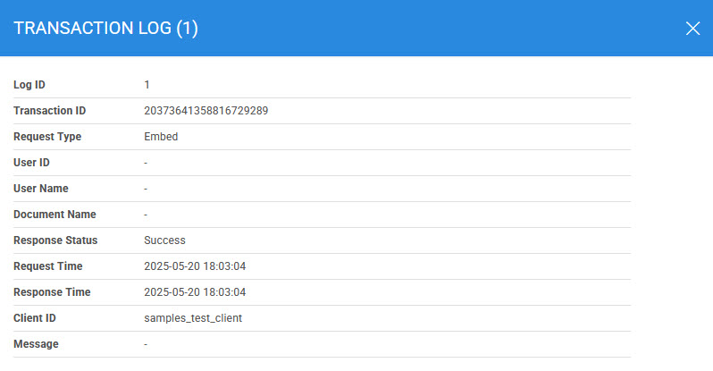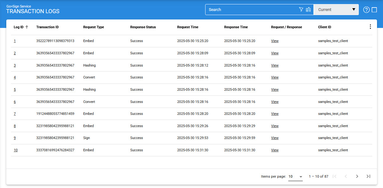 This helps to locate a particular type of signing service transaction. The transaction can be searched based on response type, response status, request time, response time and Client ID. If a search is based on multiple values, then these will be combined together using the “AND” operand, and thus only records that meet all the criteria will be presented.