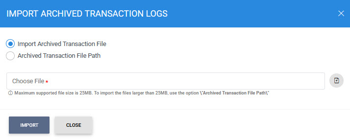 This opens a new window where you can import and view previously archived file i.e. archived/exported transactions log. |