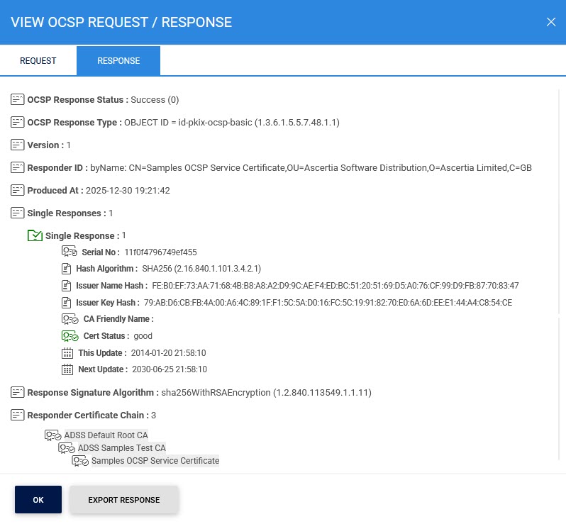 Clicking on either View link within the Response column or the View Response button shows response for the OCSP Repeater transaction as shown below: