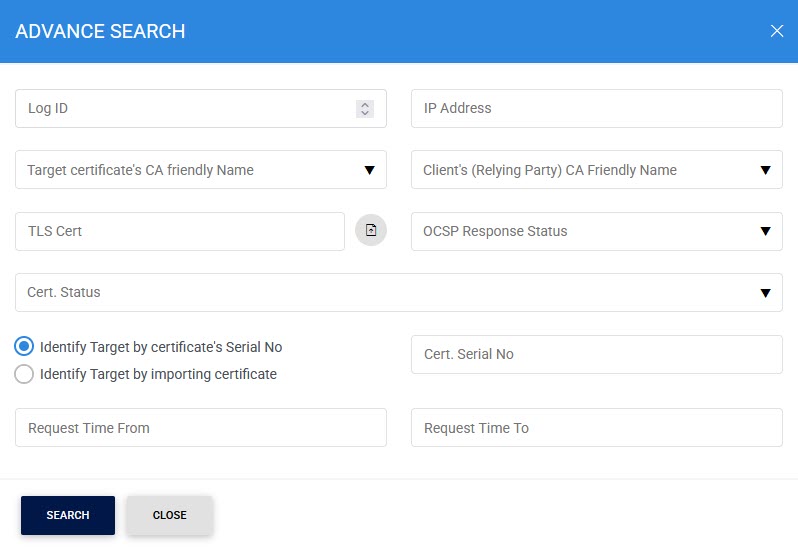 OCSP transactions log can be exported to physical drive using Export Logs button. You can either export all OCSP logs or specific OCSP logs based on provided search criteria. Note when exporting log records, the original records remain in the database (i.e. they are not removed as part of the export function). In case of auto-archiving (explained later) the archived records will by default also be removed from the database. Therefore use auto-archiving if you want to trim your database.