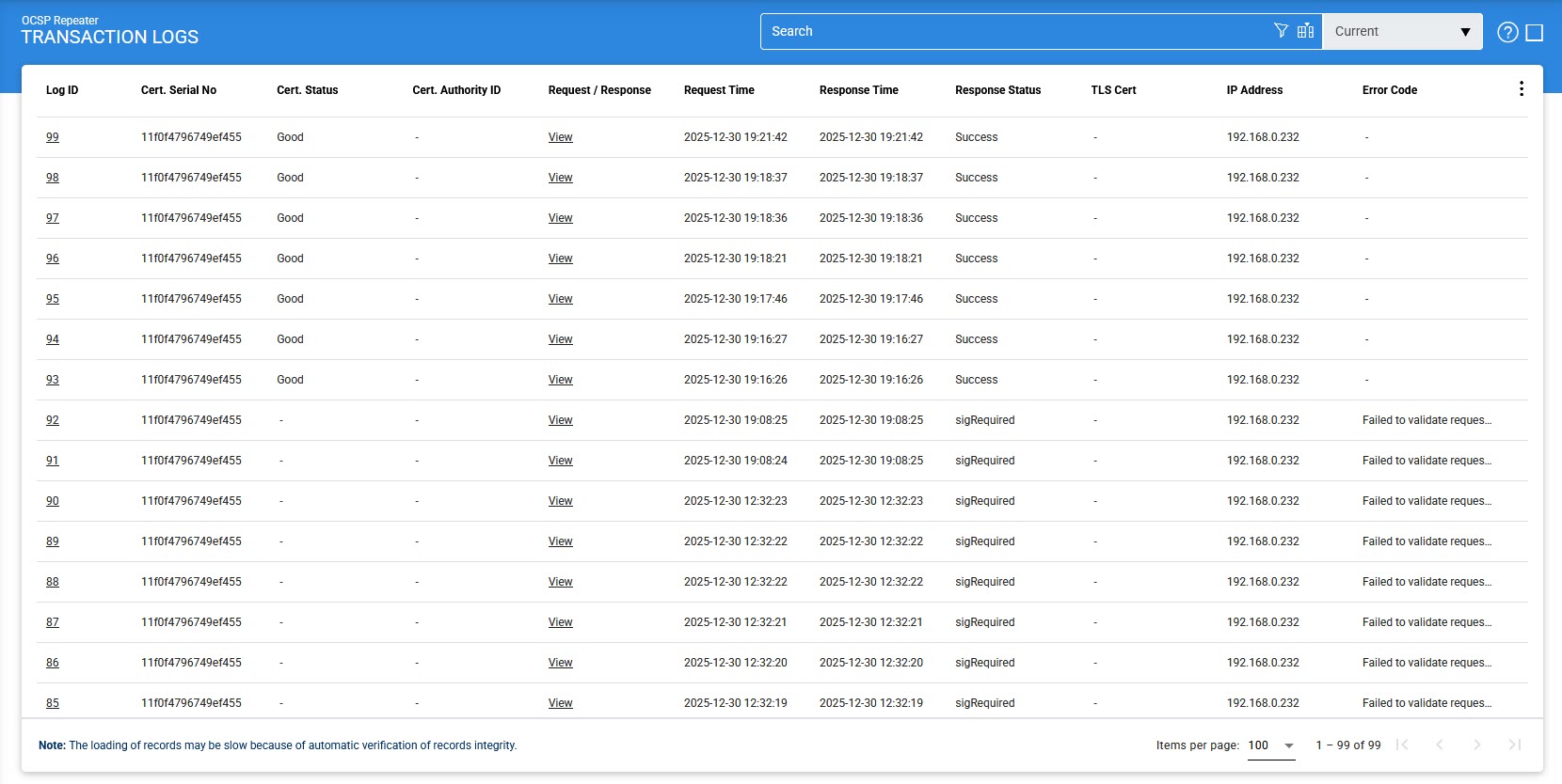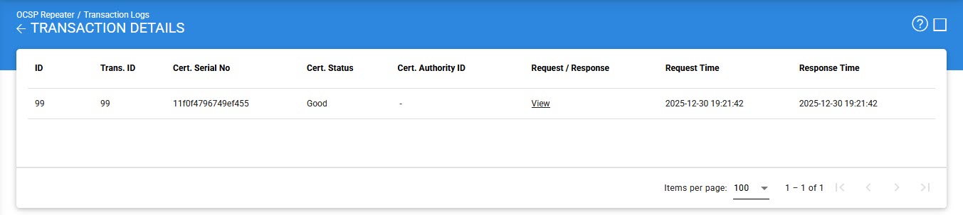 The OCSP Repeater Service Transaction Log Viewer provides a record of each request made to the OCSP Repeater Service and each response returned by the service: