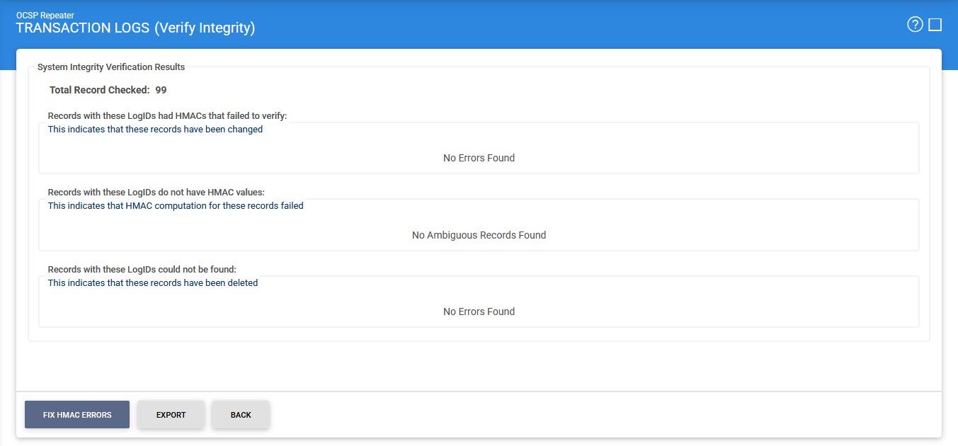 Verifies the integrity of the signing service transaction log records. It detects tampered and deleted records and generates a report that can be exported to a physical drive. Note: When exporting HMAC verification reports, it is recommended to save the file with “.html” extension so that the report can be viewed in an internet browser. |