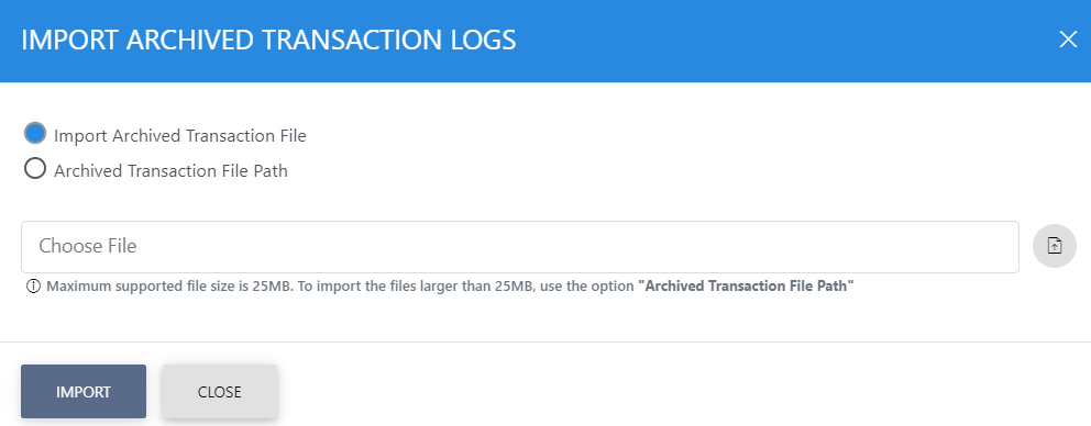 This opens a new window where you can import and view previously archived file i.e. archived/exported transactions log. |
