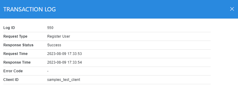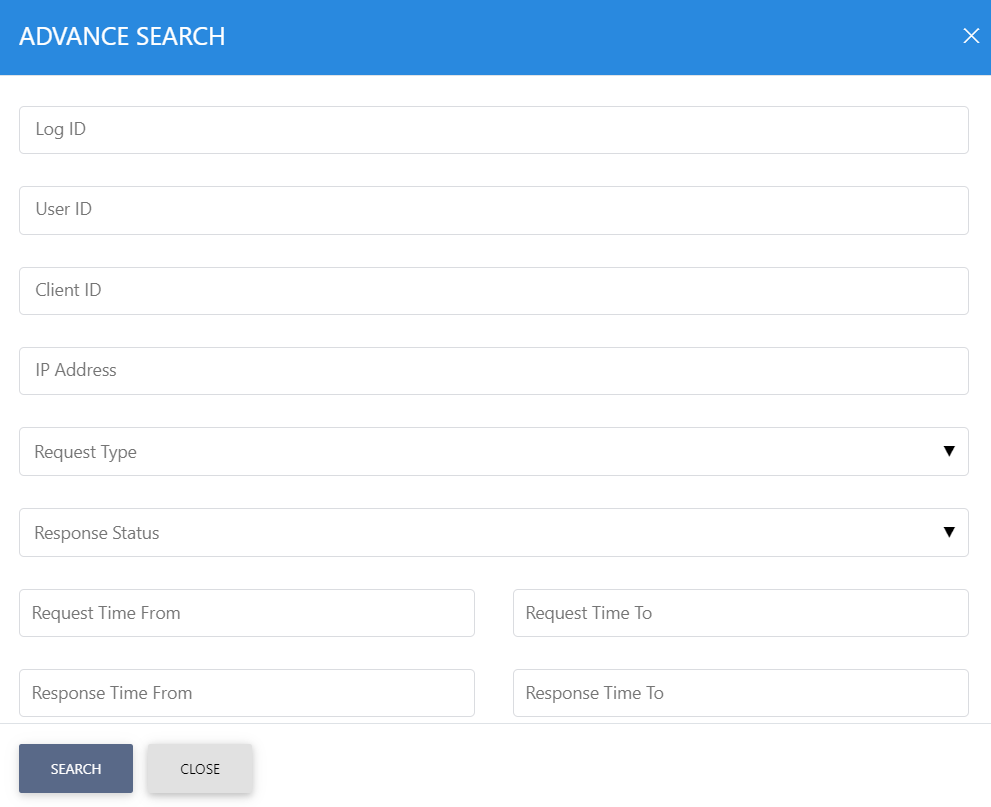 This helps to locate a particular type of SAM service transaction. The transaction can be searched based on "Log ID", "User ID", "Client ID", "IP Address", "Request Type", "Response Status", "Request Time From", "Request Time To", "Response Time From" and "Response Time To". If a search is based on multiple values, then these will be combined together using the “AND” operand, and thus only records that meet all the criteria will be presented.