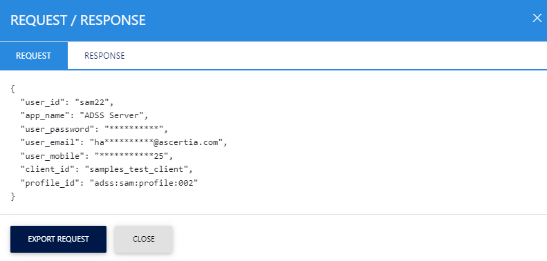 Clicking on View link under the request/response column shows the JSON request and response for the selected SAM transaction in different tabs: