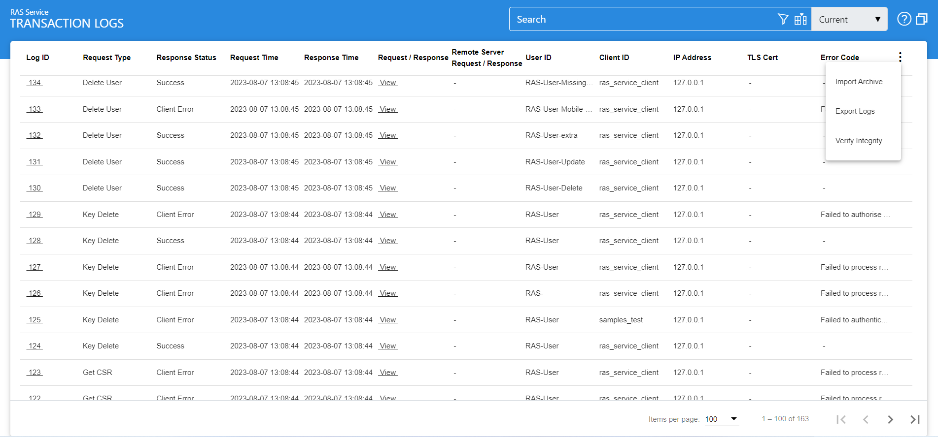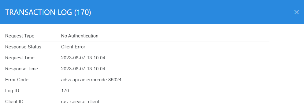 The RAS Service keeps a secure audit record of every request made and every response given within the ADSS Server database. These records can be viewed by using the transactions log viewer.