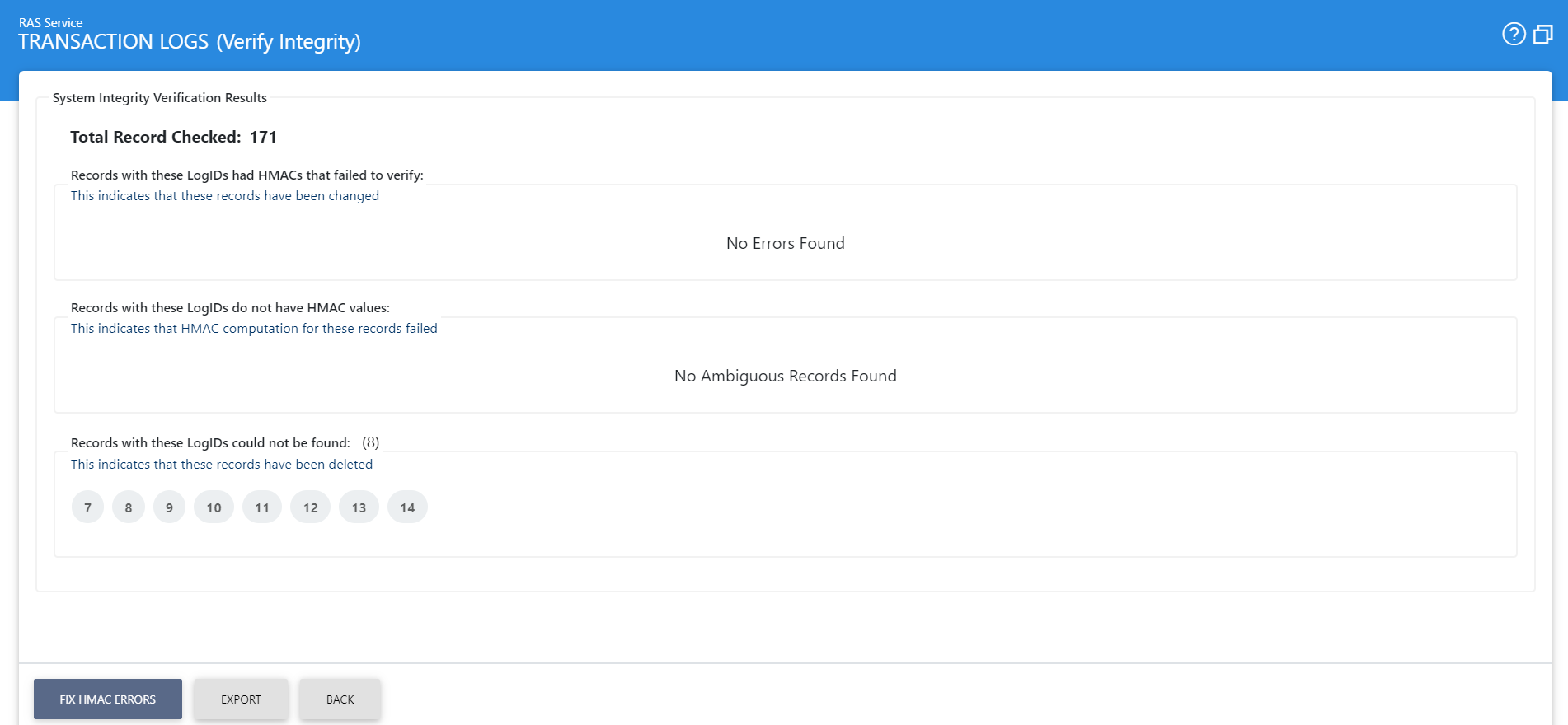 This button verifies the integrity of the RAS service transaction log records. It detects tampered or deleted records and generates a report that can be exported to a physical drive. Note: When exporting HMAC verification reports, save the file with an “.html” extension so that the report can be viewed in an internet browser. |