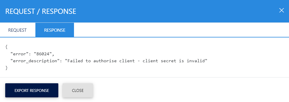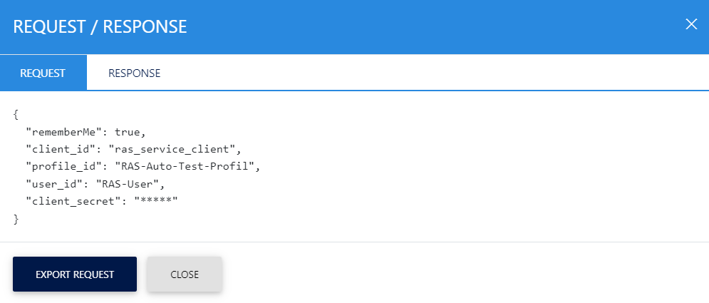 Clicking the View link under the request/response column shows the JSON request and response for the selected RAS transaction in different tabs: