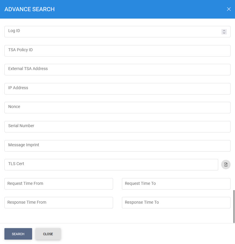 As explained above, clicking on the Advance Search icon on TSA Transaction Logs displays following screen: