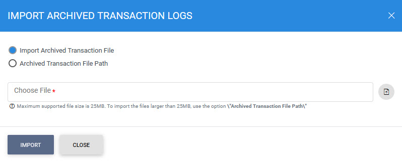 This opens a new window where you can import and view previously archived file i.e. archived/exported transactions log. |