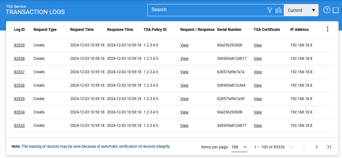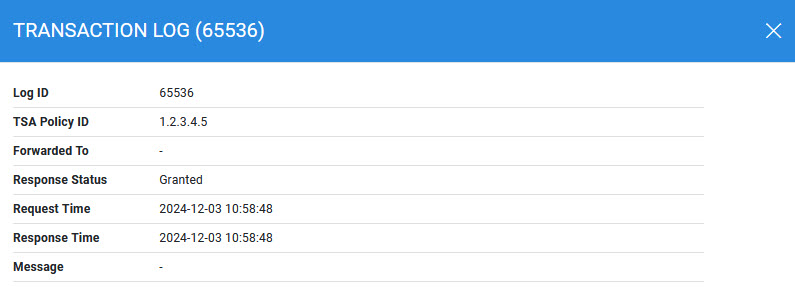 The ADSS TSA Service transaction log records every timestamp service request and response message.