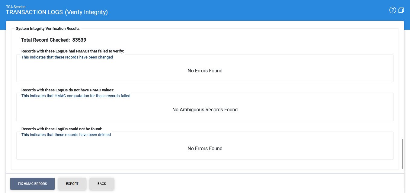 Verifies the integrity of the TSA service transaction log records. It detects tampered and deleted records and generates a report that can be exported to a physical drive. Note: When exporting HMAC verification reports, it is recommended to save the file with “.html” extension so that the report can be viewed in an internet browser. |