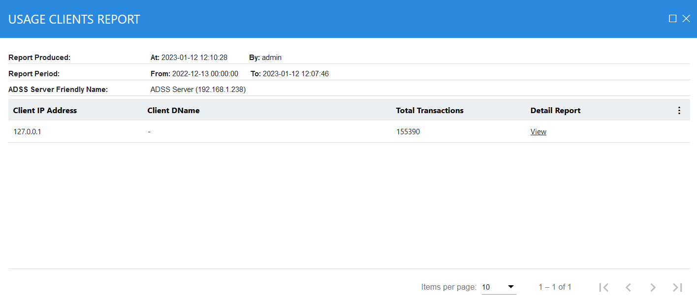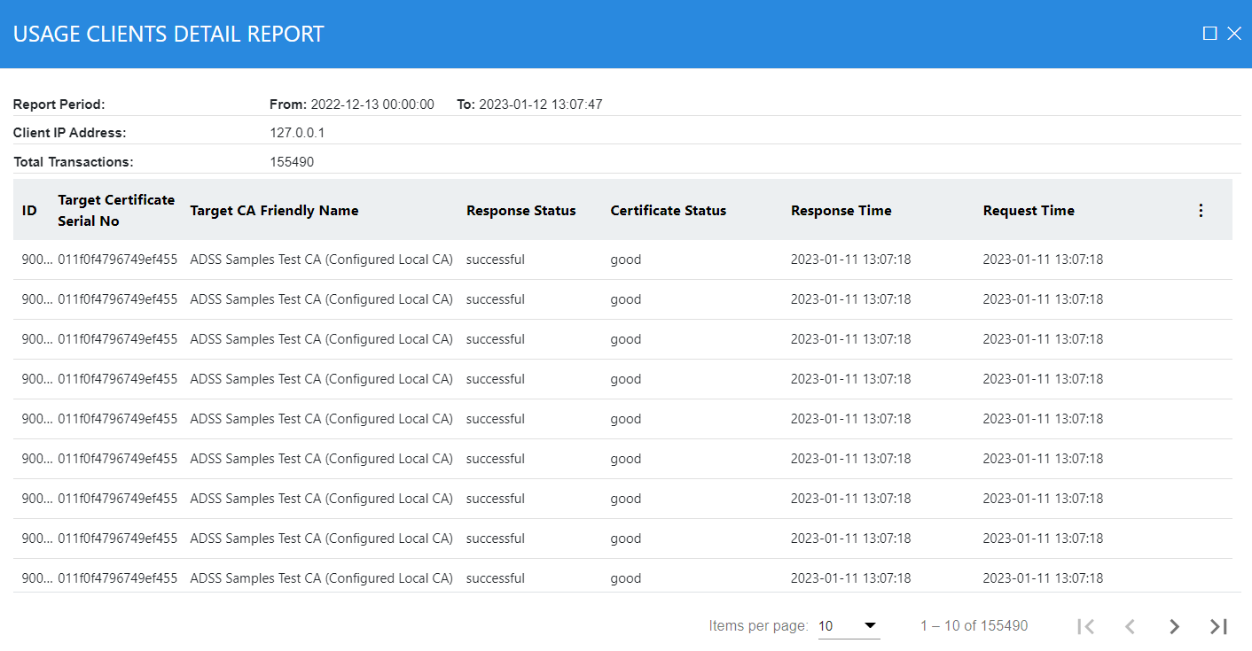Alternatively if a Client usage report was produced in the first step, then the detailed report shows all the transactions conducted by this client as shown below. Note clients are identified by the certificate DName in case requests were signed or in case of unsigned requests then via the IP address of the client: