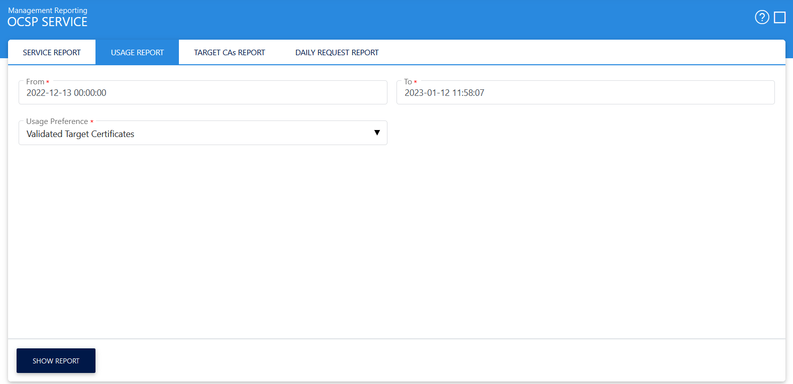 First select the date range for your report. Then select whether to report on target certificates or on clients. Then press the Show Report button. The table will be refreshed with the configured details. This report can be exported as a zipped CSV file.