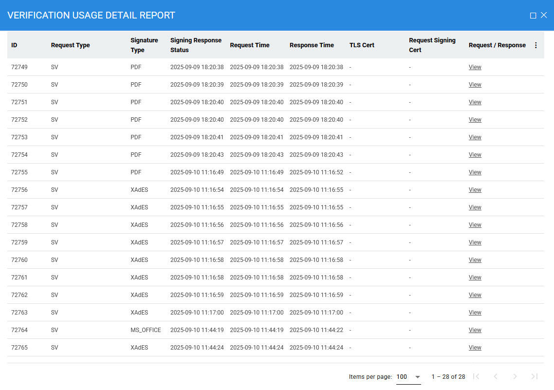 The Usage Report helps you track and review how your service is being used by different clients. It provides clear insights into which clients are sending requests to your service and identifies the clients who are using it most frequently. This makes it easier to understand usage patterns and client activity. The report is generated according to the date range you select, and you can further customize it using the Usage Preference drop-down menu. The available options are: 'Clients that send verification requests' and 'Clients that verified signatures.'