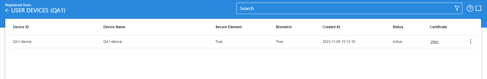 This helps to search a particular User Device of a registered user. The User Devices can be searched based on their "Status", "Device ID", "Device Name", "Secure Element", "Biometric", "Created At From" and "Created At To". If a search is based on multiple values, then these will be combined together using the “AND” operand, and thus only records that meet all the criteria will be presented.