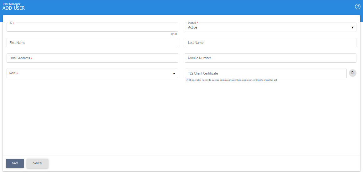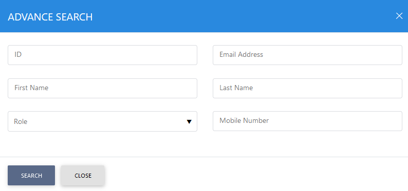 This helps to locate a user generated the Manage users service. The user can be searched based on "ID", "Email Address", "First Name", "Last Name", "Role" and "Mobile Number". If a search is based on multiple values, then these will be combined together using the “AND” operand, and thus only records that meet all the criteria will be presented.