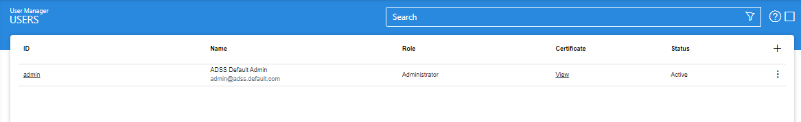 To create an user account, click the Users button under User Manager. A table of all existing users for this ADSS Server will be displayed: